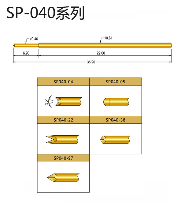 SP040探針的總長度為35.9mm,針管由黃銅鍍金制成,而彈簧則采用不銹鋼線。